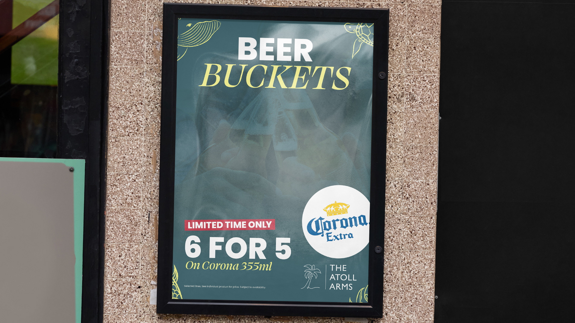 The next instalment of rebranding NAAFI's pubs and lounges around the world. I created the logo and brand identity for 'The Atoll Arms', an all-in-one facility offering retail and hospitality services to UK Armed Forces troops on the remote island of Diego Garcia in the Indian Ocean.